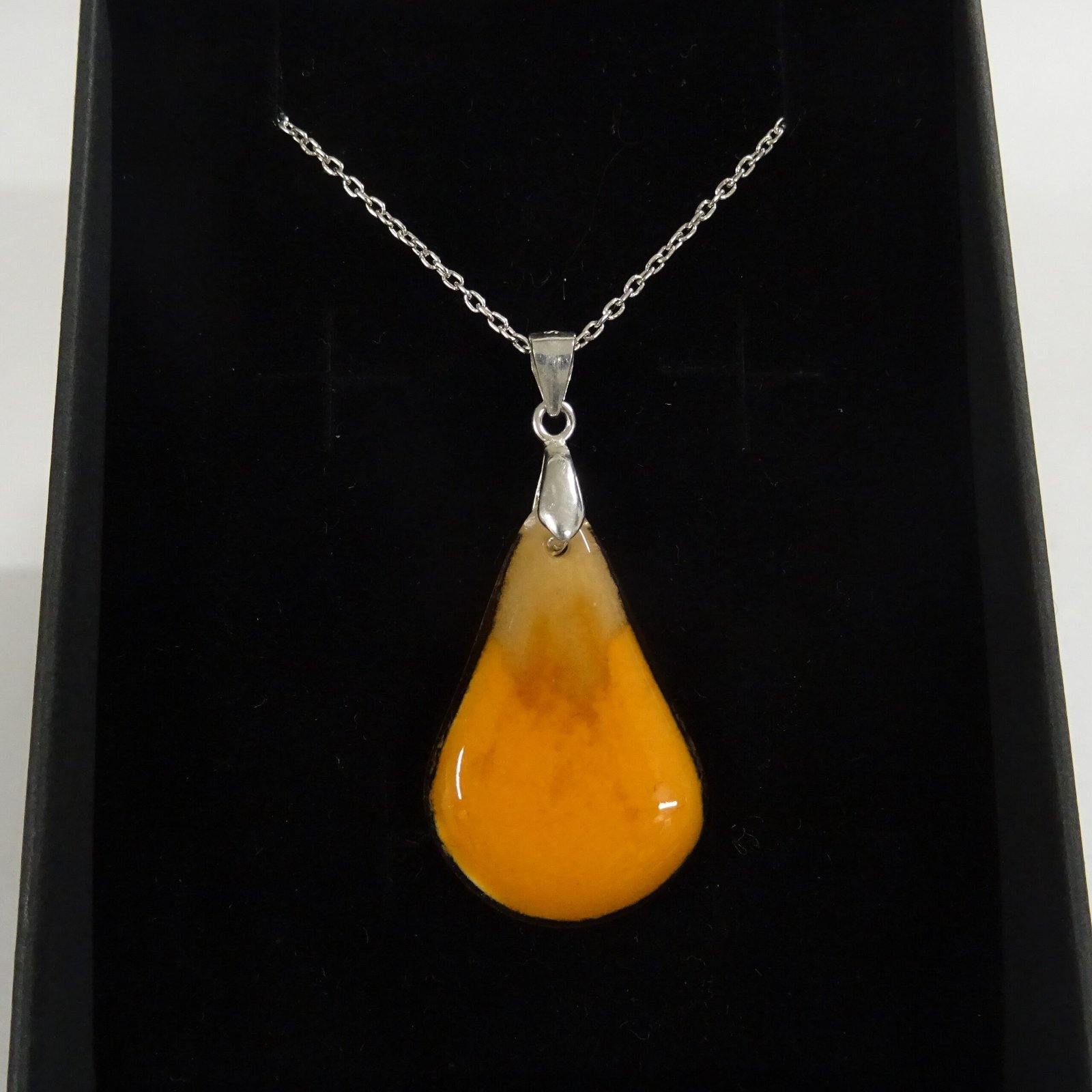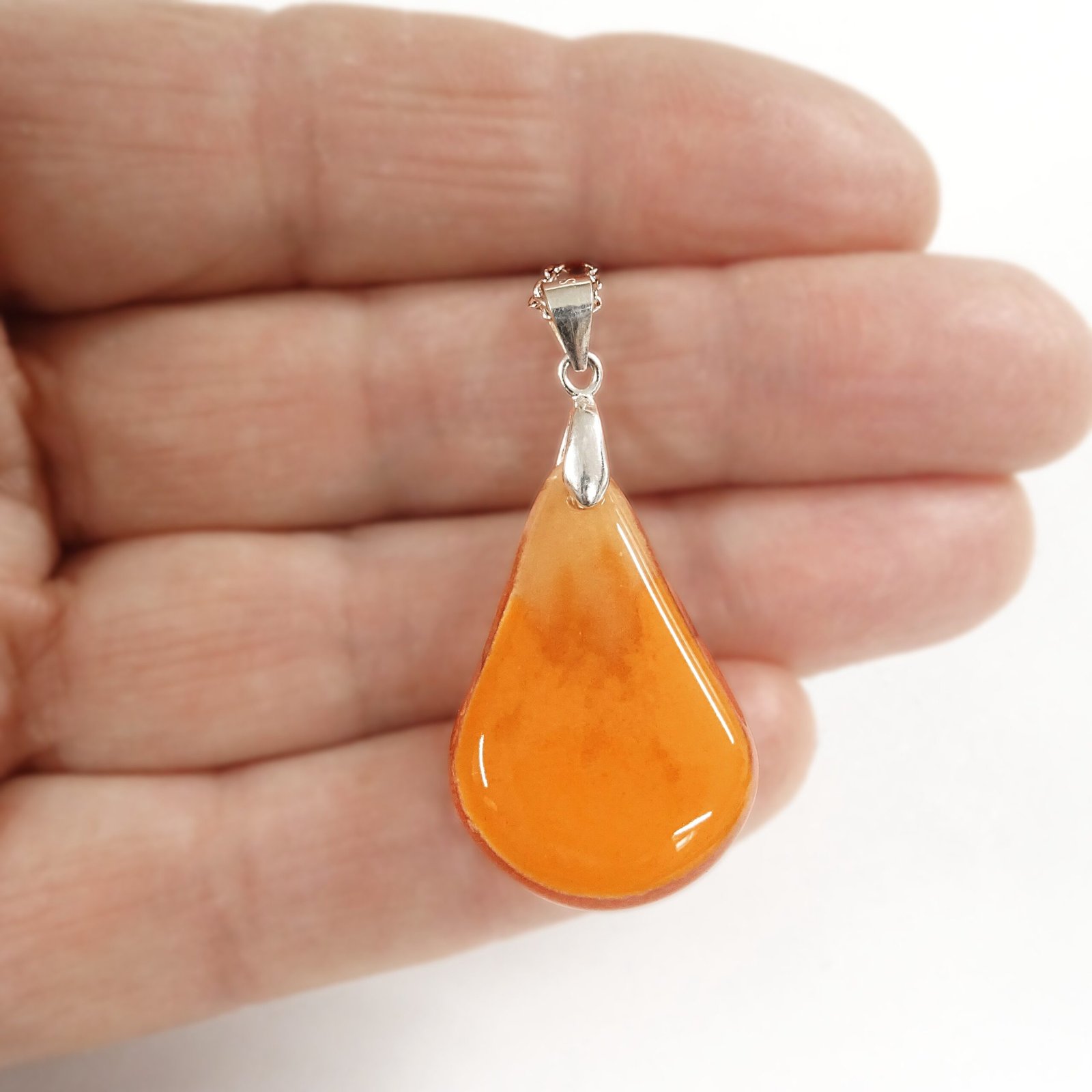 This pendant uses swirles of orange, white and vanilla powders to create a flame-like effect.