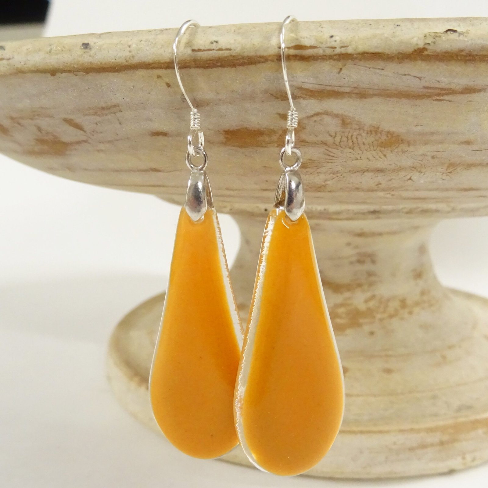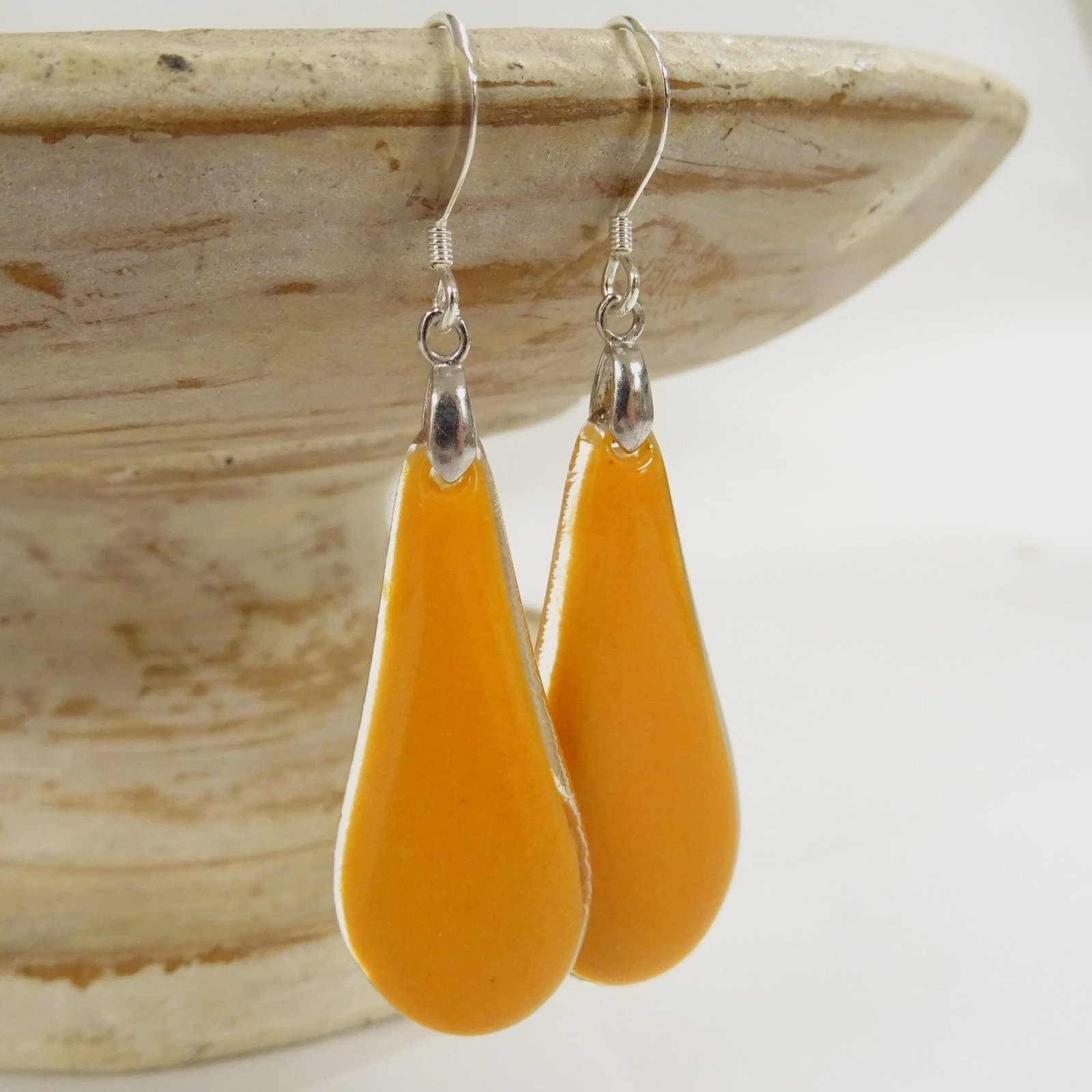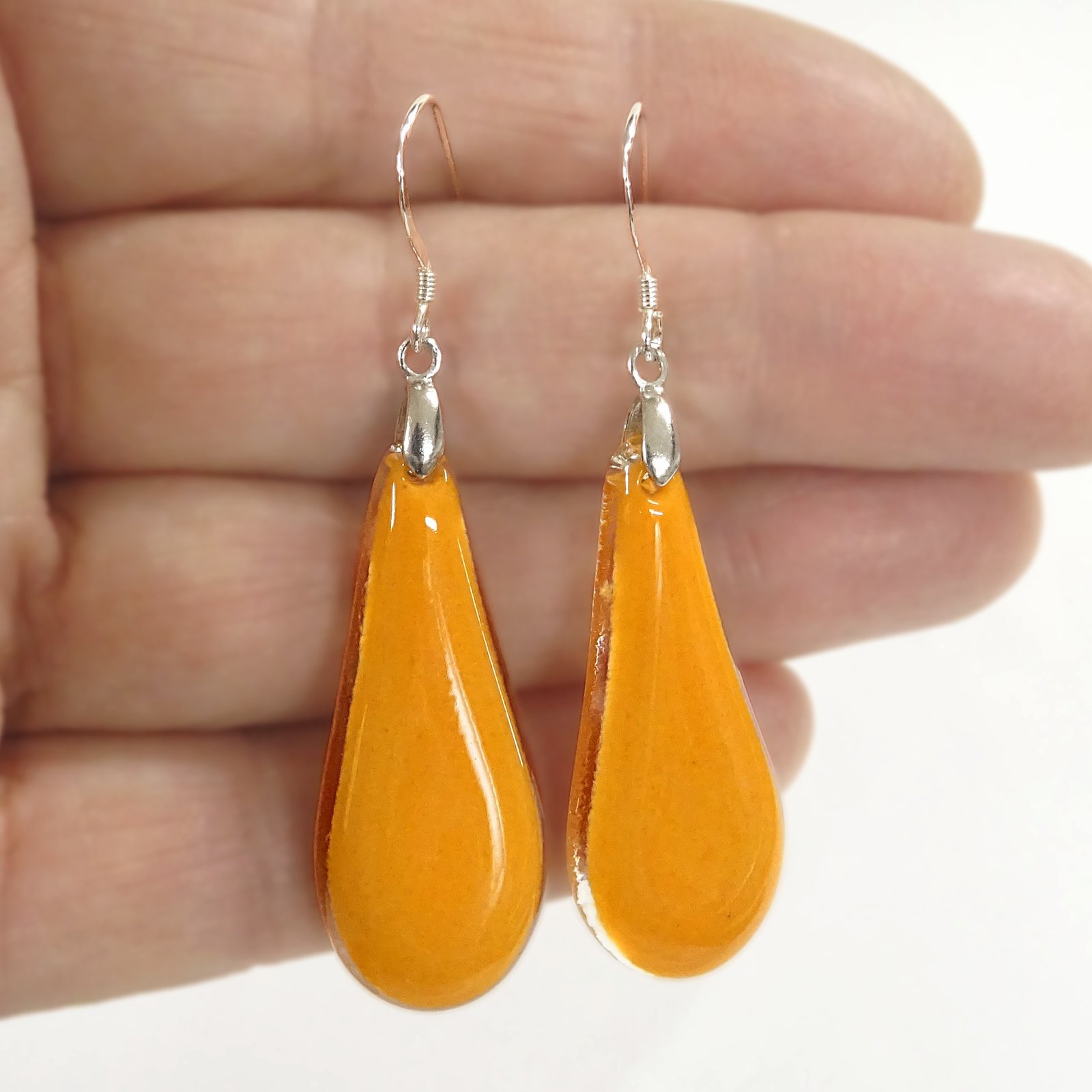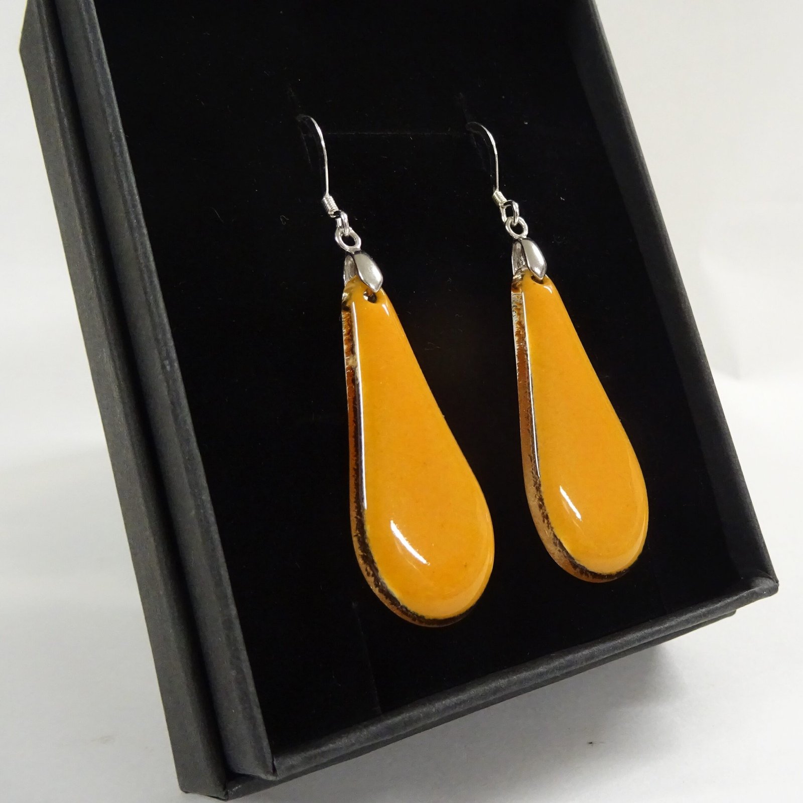 These earrings combined clear art glass with peach/orange enamels and are fitted with sterling silver findings. They are packaged in a small gift box.
